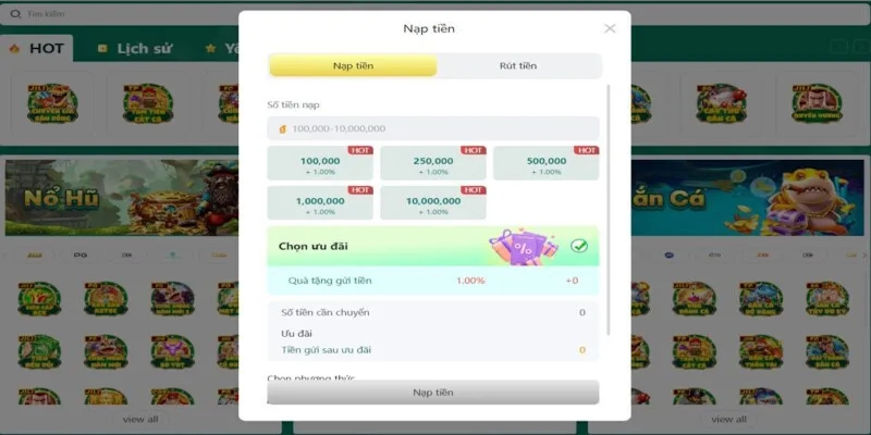 - Bước 1: Chọn Nạp tiền sau khi truy cập đúng đường liên kết mới nhất và đăng nhập.